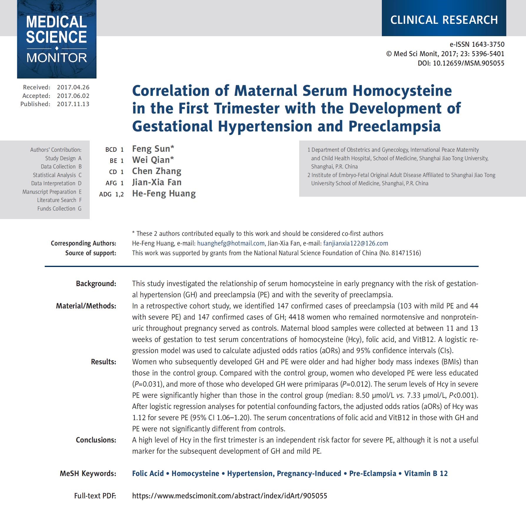 2. Sun F, Qian W, Zhang C, Fan JX, Huang HF. Korelasi homocysteine serum ibu pada trimester pertama dengan Pengembangan hipertensi gestasional dan preeklampsia.Monit Med Sci, 2017 13 Nov; 23: 5396-5401.